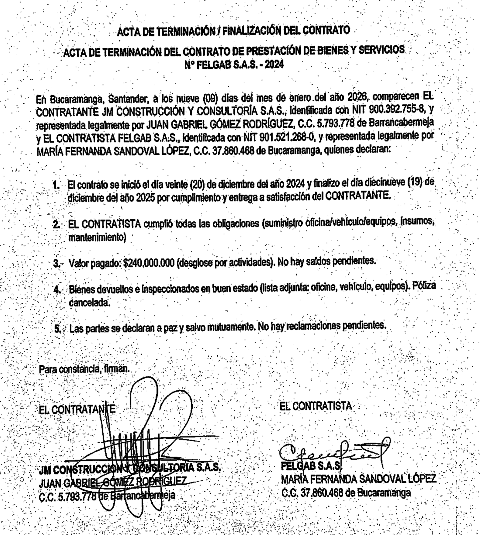 Lo curioso es que, apenas unos meses antes, JM Construcciones terminó certificándole a Felgab exactamente los mismos ítems que ahora le exigía la Universidad de Pamplona: 1. arriendo de oficinas, 2. mobiliario, 3. alquiler de equipos de medición y —sorpresa— 4. el alquiler de un vehículo 4x4.