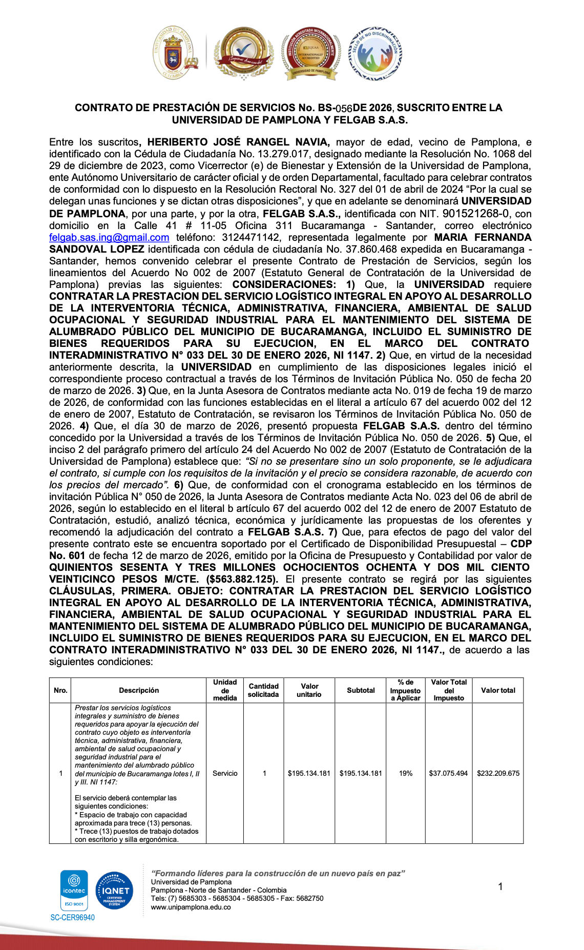 Esos servicios fueron contratados por 563 millones de pesos con la empresa bumanguesa Felgab S.A.S., que presentó su oferta a la universidad el 30 de marzo de 2026. Para sustentar dicha oferta, Felgab se apoyó en varios contratos realizados con JM Construcciones Consultoría S.A.S.