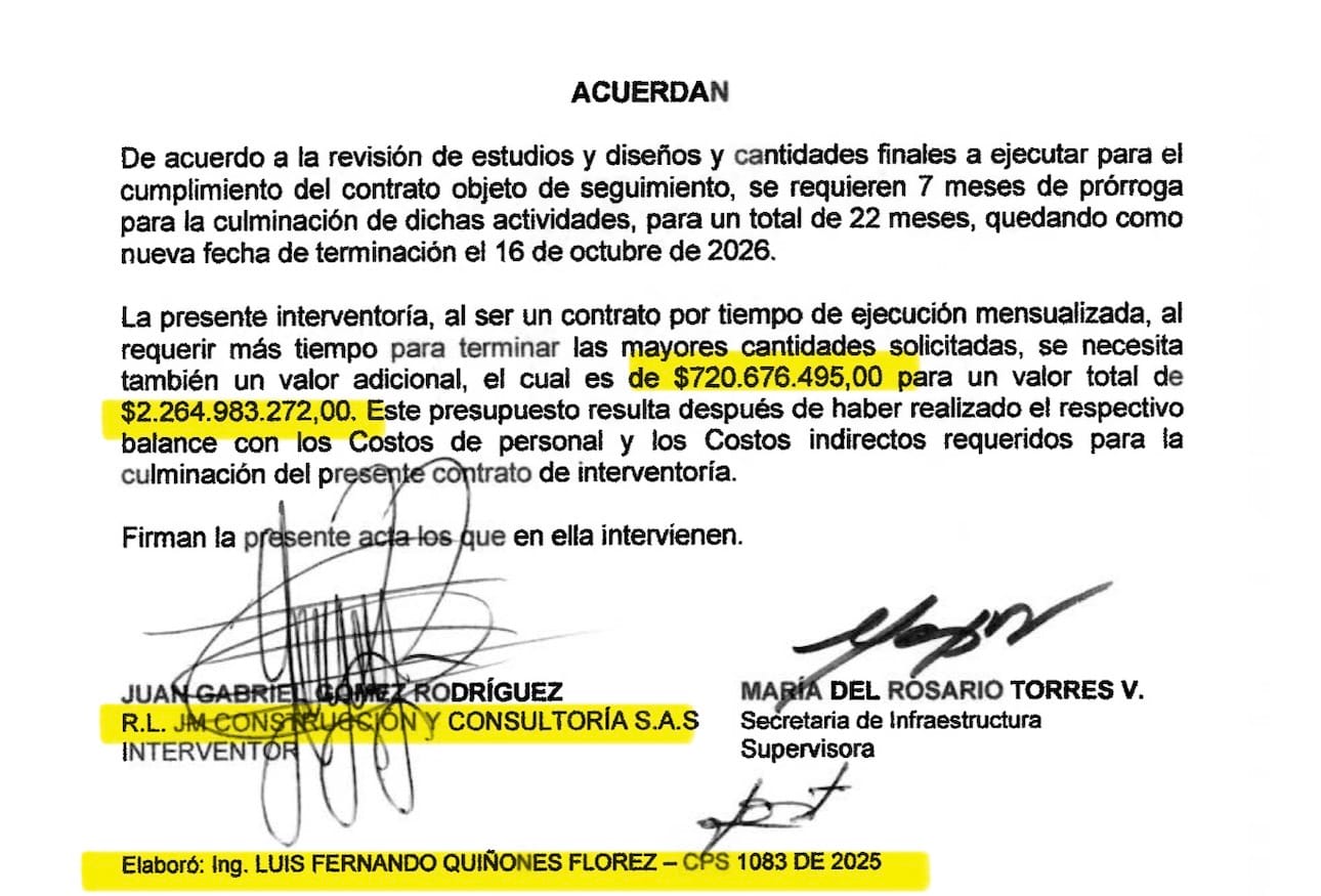 El otro dueño del 5% restante, es la misma empresa JM Construcciones, quien recibió más de 2.264 millones de pesos por el contrato N0 228 de 2024 de la misma secretaría de infraestructura, para hacer la interventoría a las obras de mitigación del Barrio La Feria, obras que se le entregaron al constructor Manuel Guillermo Camacho por más de 27 mil millones de pesos, y donde María del Rosario Torres, también hacía las veces de supervisora.