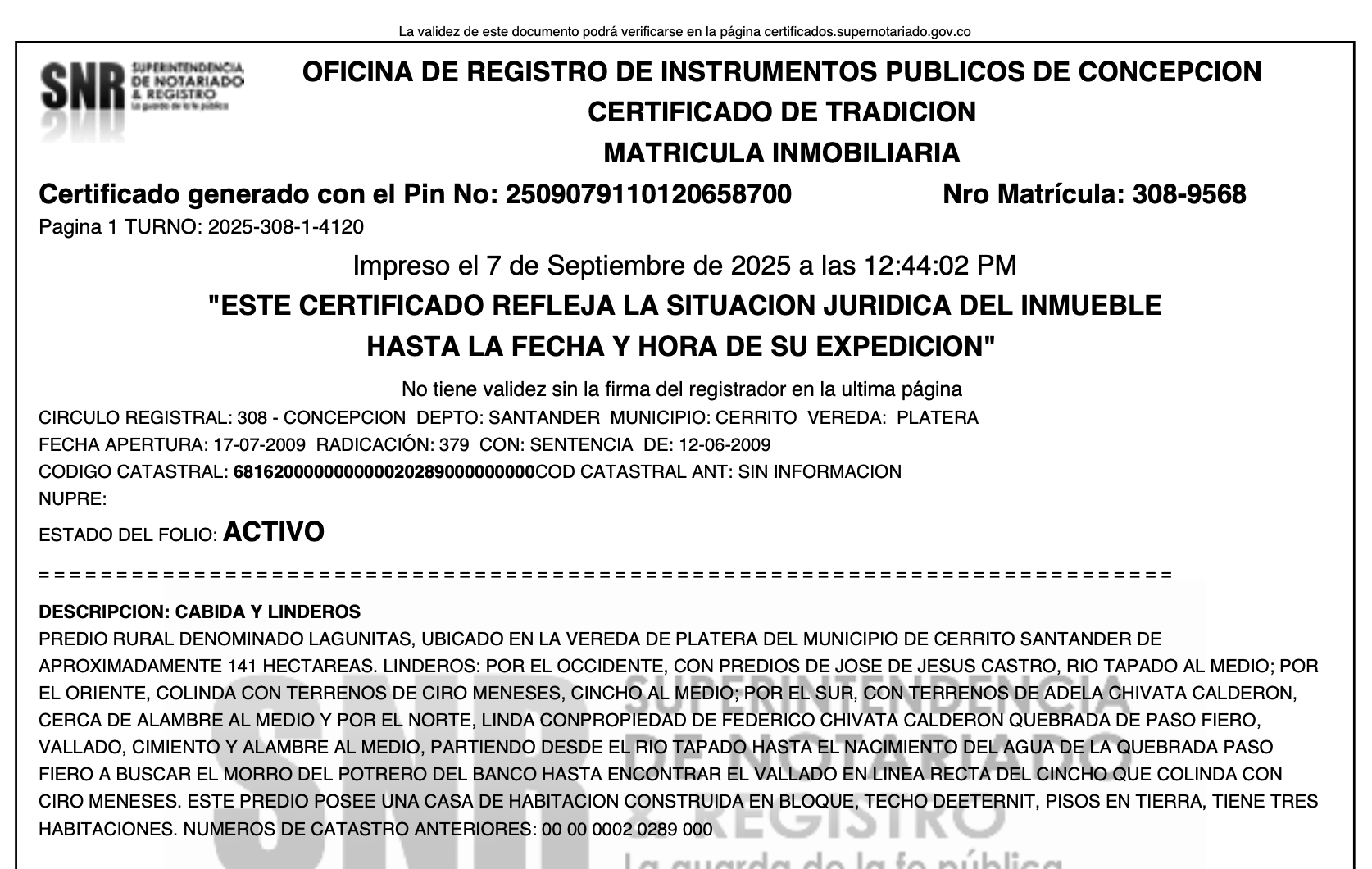 Frente al asunto, ya existe una sentencia de pertenencia de 2009, inscrita en la Oficina de Registro de Instrumentos Públicos (ORIP) de Concepción, que abrió el folio del inmueble (matrícula 308-9568), proferida por el Juzgado Promiscuo del Circuito de Málaga, lo cual es importante por dos razones. La primera, porque las sentencias ejecutoriadas generan efectos reales y se presumen válidas mientras no sean anuladas o dejadas sin efecto por la autoridad competente y la segunda, porque la fe pública registral protege la confianza de la ciudadanía en lo que está inscrito.